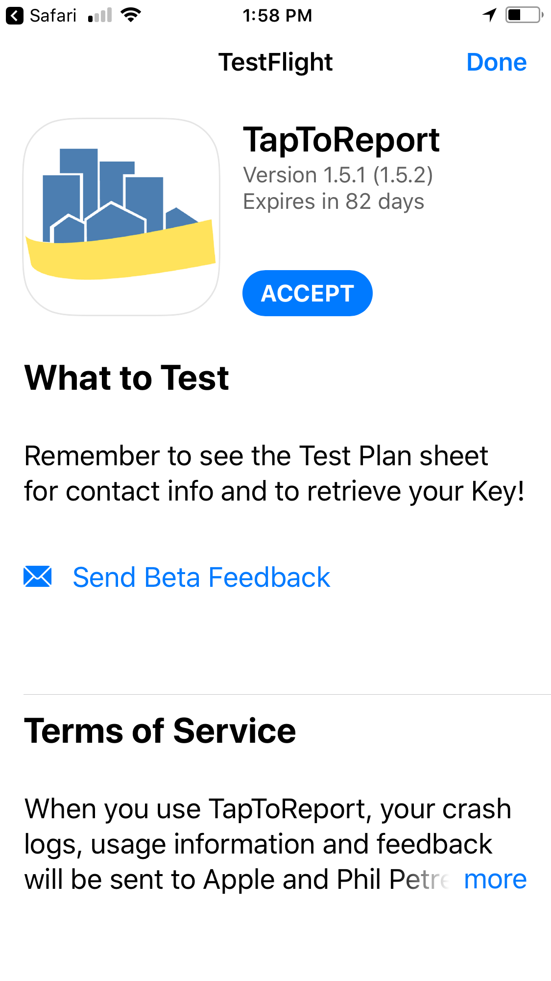 11. TestFlight will prompt you to accept the invitation to test TapToReport. Accept that and TapToReport will be installed. |